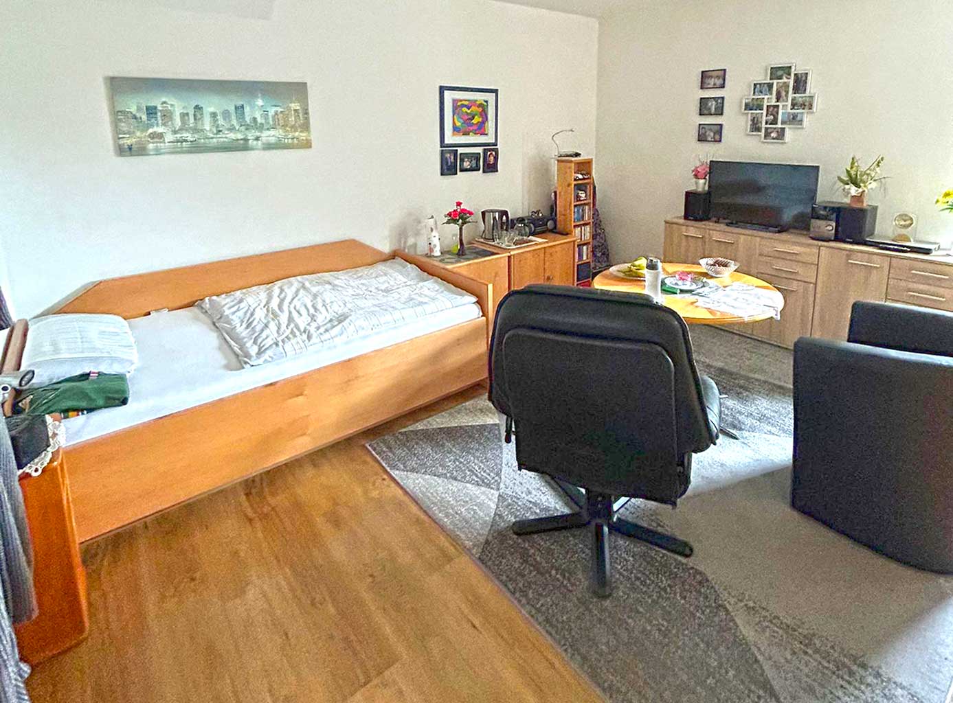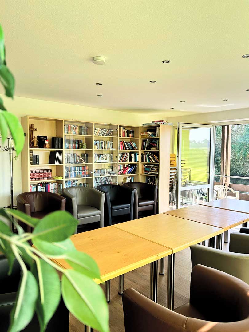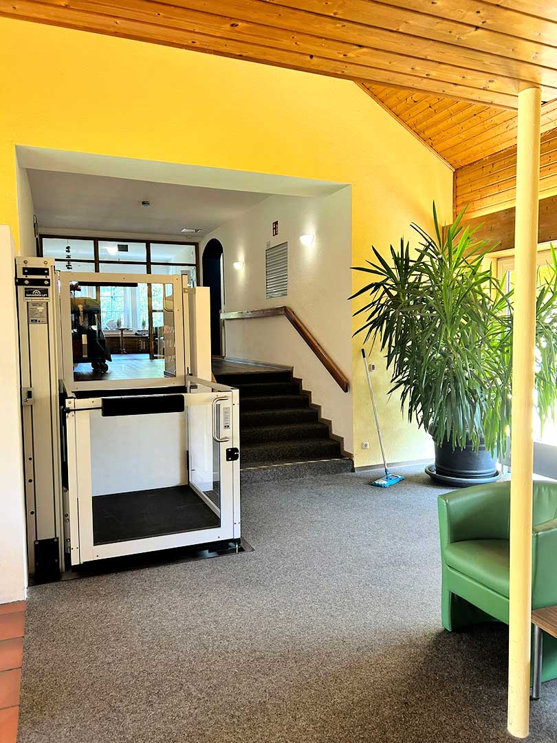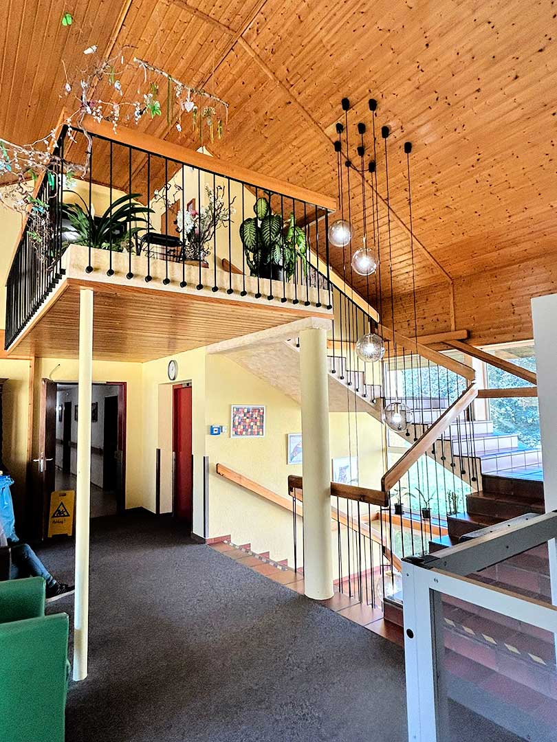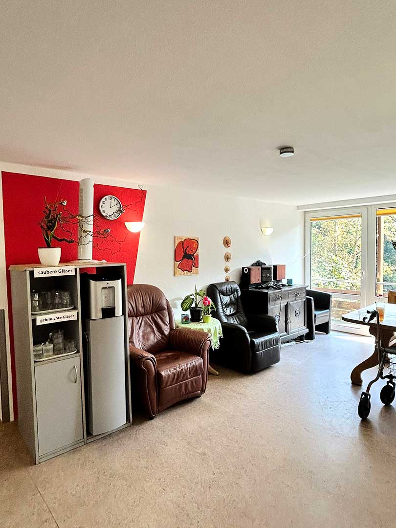Gemütliche Aufenthaltsräume, teilweise mit Fernseher, bieten Raum für Gemeinschaft, während die helle, große Eingangshalle als lebendiger Treffpunkt dient. Ein Aufzug stellt sicher, dass auch körperlich eingeschränkte Bewohner alle Etagen des Hauses problemlos erreichen können.