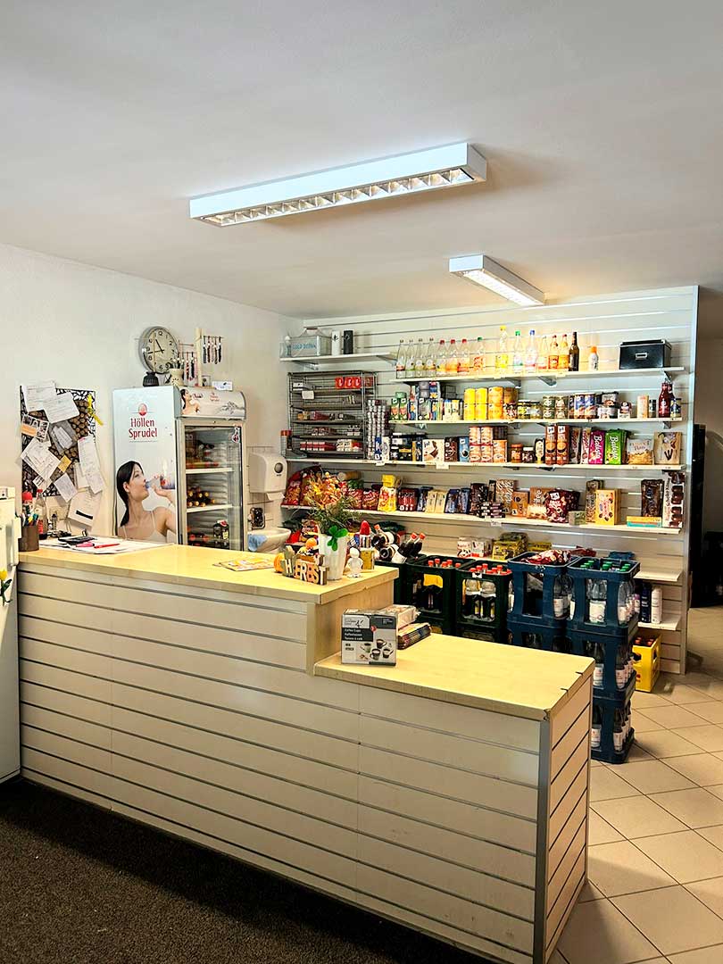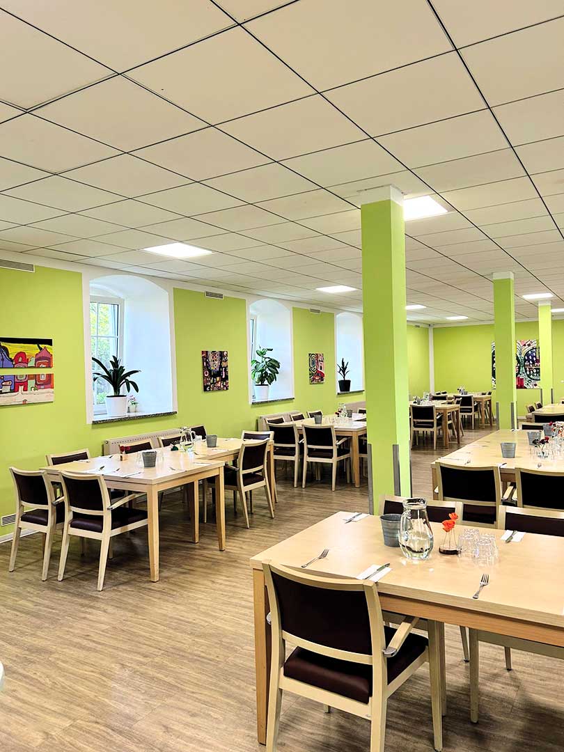 Ein weiterer zentraler Anlaufpunkt ist unser Hofladen, der mehrmals täglich – auch am Wochenende – geöffnet ist. Hier können die Bewohner Dinge des täglichen Bedarfs erwerben. Unsere hauseigene Küche legt großen Wert auf eine abwechslungsreiche und den Bedürfnissen der Bewohner angepasste Ernährung. Das Essen für alle unsere Häuser wird hier täglich frisch zubereitet.